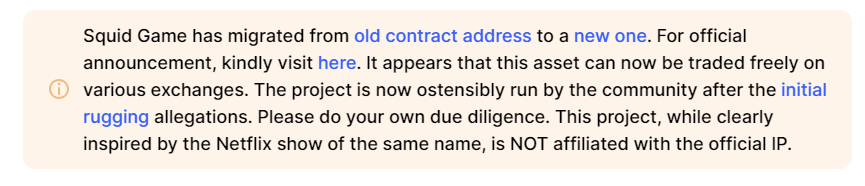The revived SQUID Game Token’s page on the crypto analytics platform CoinMarketCap states that the project has migrated from an old contract address to a new one, “now ostensibly run by the community after the initial rugging allegations.”