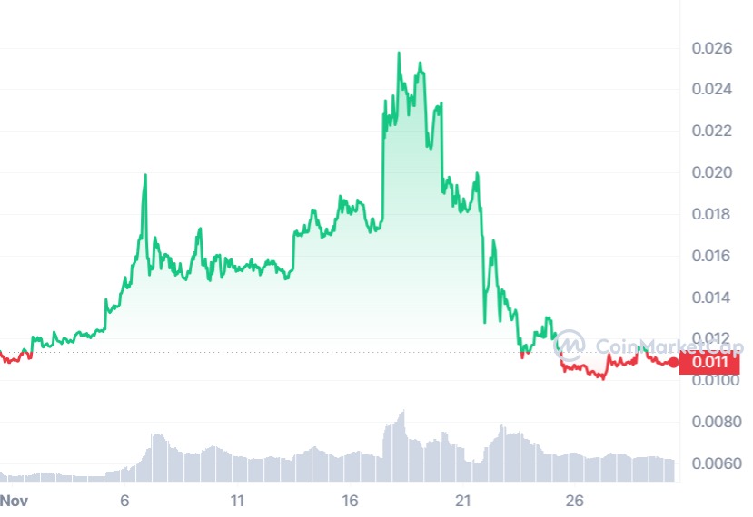 The circulating supply of SQUID is undisclosed, but the max supply is capped at 800.00m. While the highest point in the last month was $0.02576 on November 11, the lowest was $0.0106 on November 30, 2023.
