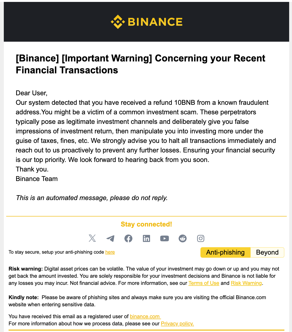 Our risk team works around the clock to safeguard the Binance ecosystem, ensuring a frictionless user experience through an array of advanced tools and measures. We’re always looking to improve our technology, products, and operations to best serve our users. As the landscape of crypto scams continues to develop, it is essential for Binance to continue maintaining the best protective standards and for users to remain educated on these.