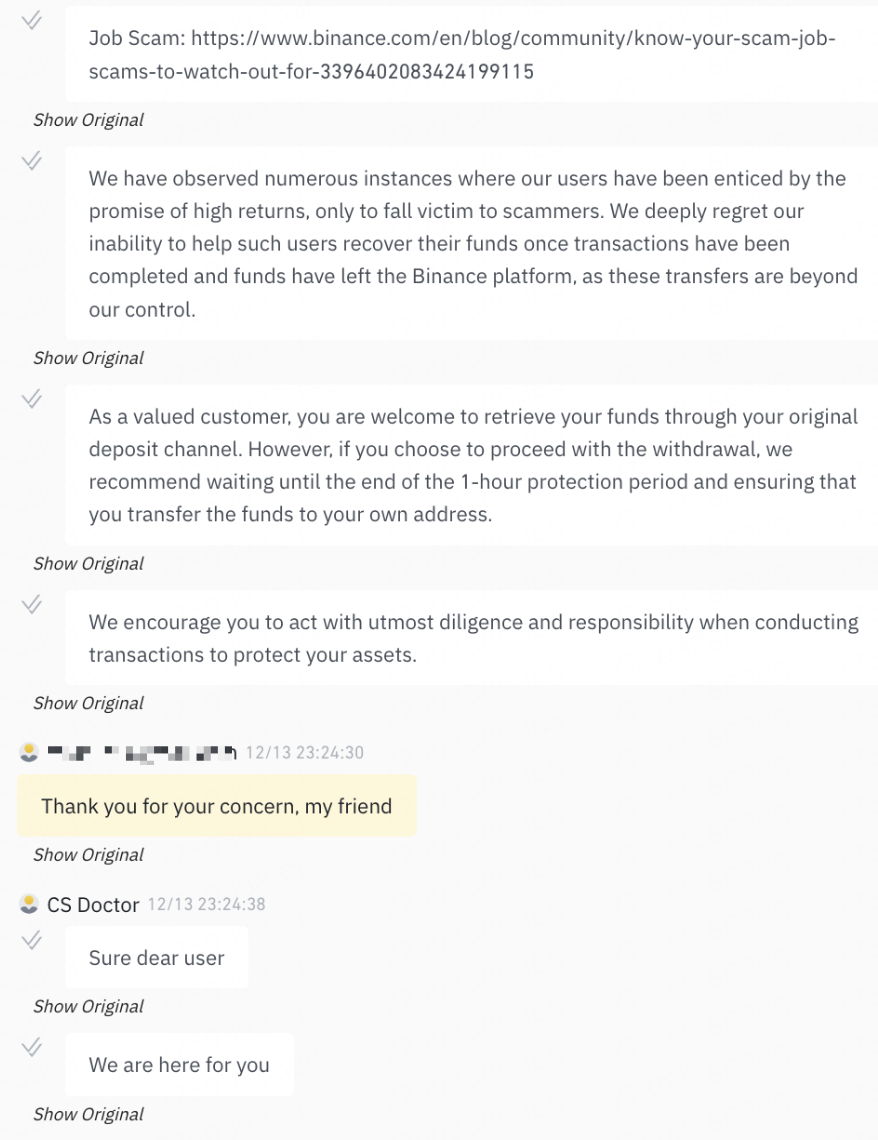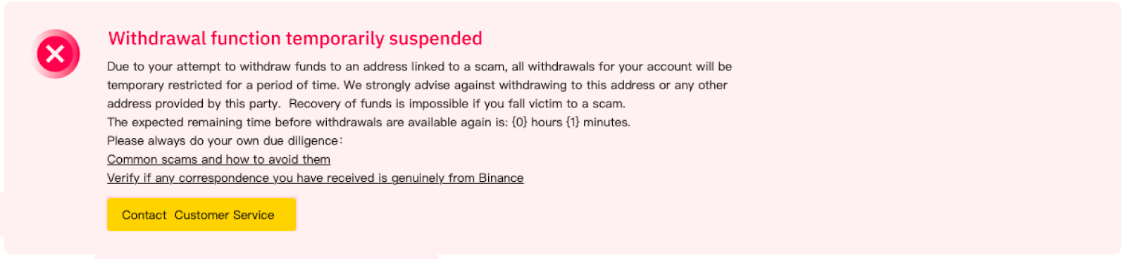 As one of our mitigation measures, the cooling-down service is designed for potential victims of impulsiveness, with Binance helping them stay calm before withdrawing funds. During this hour, the withdrawal function of the potential victim will be disabled, and we will guide the user through conducting a risk investigation.