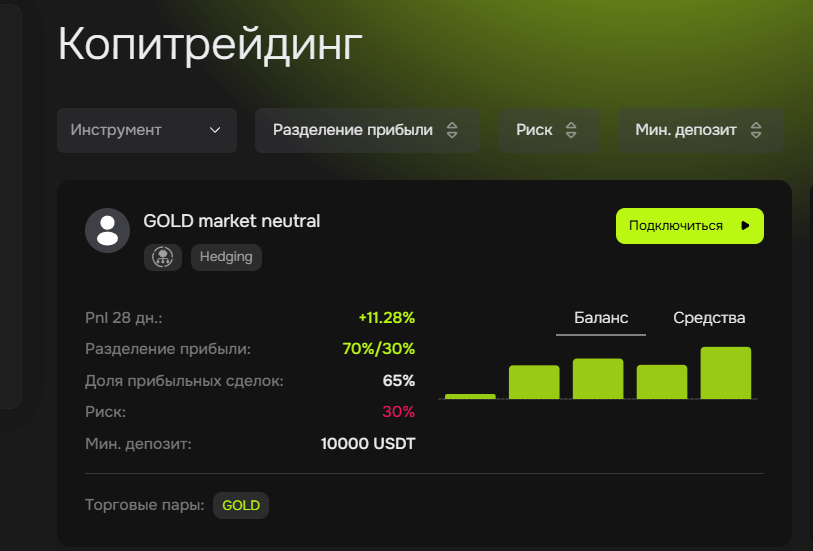 Также показаны графики баланса и средств — по ним легко оценить динамику работы алгоритма. Разделение прибыли (например, 70/30) и риск-лимит (25–30%) позволяют сразу понять условия подключения.