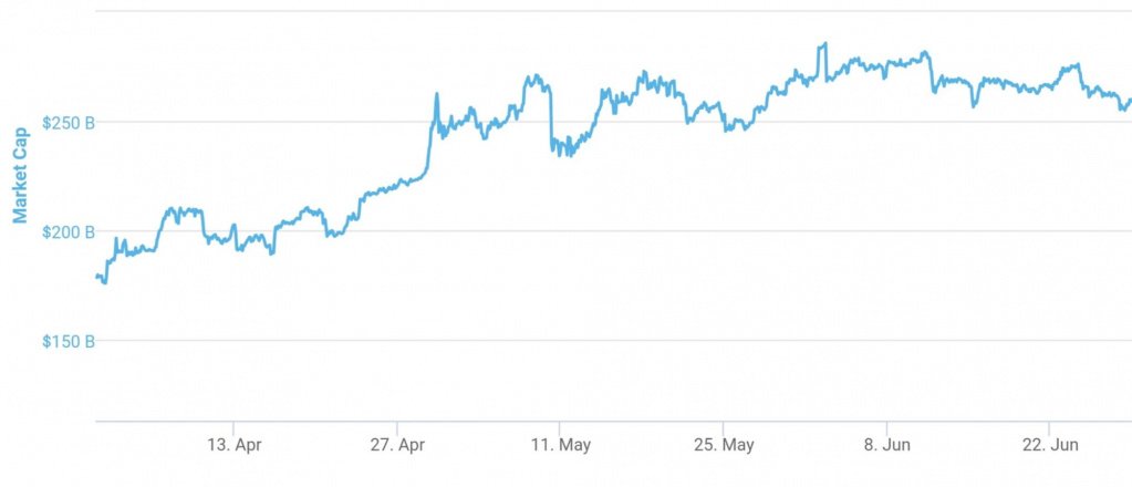 На протяжении всего второго квартала наблюдался восходящий тренд. Капитализация рынка криптовалют за этот период выросла со 178,4 млрд долларов до 260,3 млрд долларов. По сравнению с началом года показатель увеличился на 26%.В начале июня совокупная стоимость криптовалют поднималась выше 283 млрд долларов (максимальное значение — 283,8 млрд долларов). Минимум был зафиксирован 2 апреля —184,8 млрд долларов.