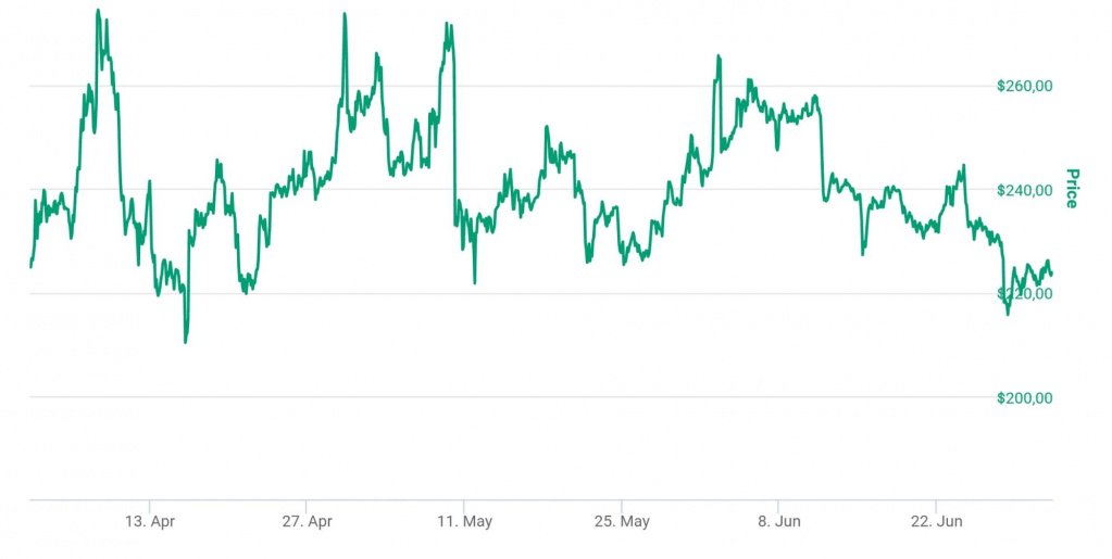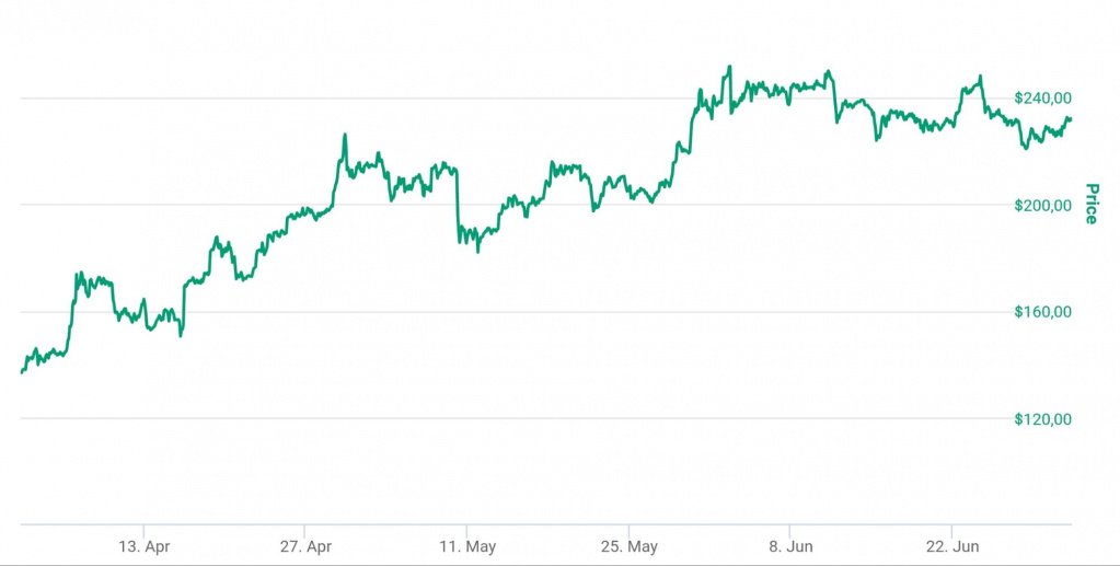 Bitcoin Cash подорожал по итогам квартала на 0,5%, однако в течение периода его цена неоднократно поднималась выше уровня 260 долларов. Капитализация монеты изменилась несущественно.