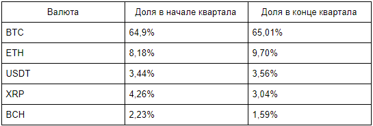 Доля биткоина в капитализации криптовалют за второй квартал практически не изменилась. Ethereum и Tether смогли нарастить свои доли — на 1,52 п.п. и на 0,12 п.п. соответственно. Доли XRP и Bitcoin Cash, напротив, сократились, на 1,22 п.п. и на 0,64 п.п. соответственно.Таблица 1. Доли крупнейших криптовалют