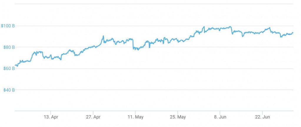 Совокупная стоимость альткоинов выросла на 45,4% — с 63,2 млрд долларов до 91,9 млрд долларов. 2 и 11 июня показатель превышал уровень в 98 млрд долларов.