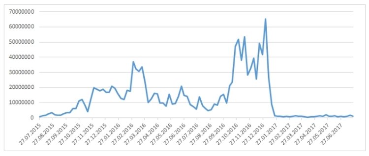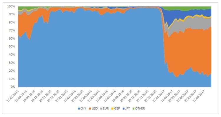 Из приведенной ниже диаграммы видно, что до 2017 года практически все конвертации осуществлялись с участием юаня, однако на протяжении периода февраль–июль 2017 г. лидирующие позиции из всех фиатных валют, участвующих в обменных операциях с криптоденьгами, занимает американский доллар. На долю американской валюты приходится более половины всех операций.