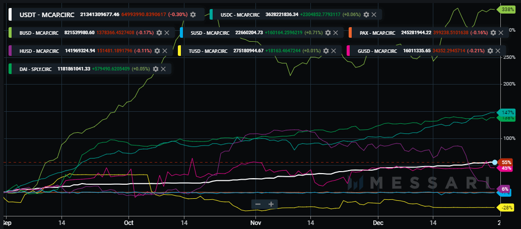 На следующем графике рост объемов стейблкоинов за последние 4 месяца. В лидерах — Binance USD (BUSD).