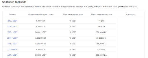 Торговля на спотовом рынке предусматривает комиссию за транзакцию 0,1% (для мейкеров и для тейкеров):