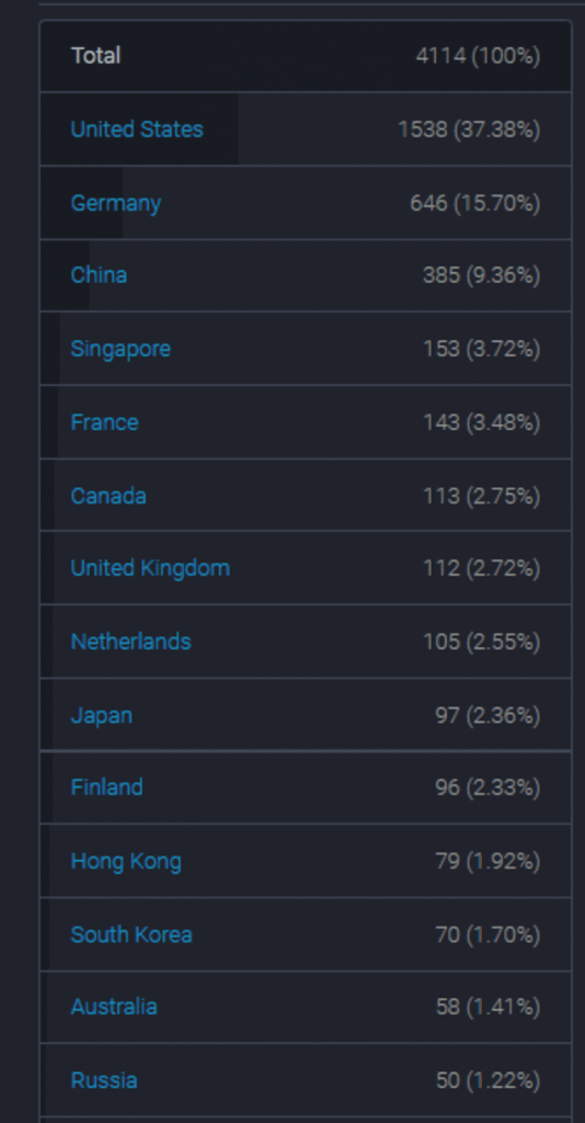 По состоянию на 27 июня насчитывалось 4177 узла эфириума, что на 4,39% меньше, чем на предыдущей неделе. В частности, в США насчитывалось 1546 узлов, 656 узлов в Германии и 412 узлов в Китае, на каждый из которых приходилось 37,01%, 15,71% и 9,86% от общего числа узлов соответственно.