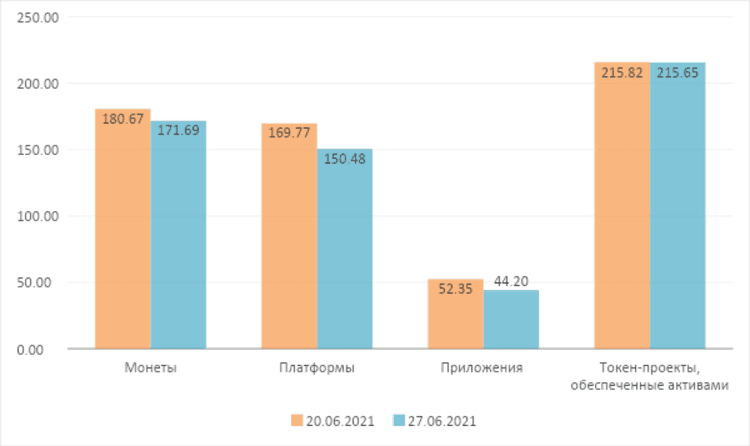 В сегменте 100 ведущих криптовалютных проектов, наибольшее снижение общей рыночной капитализации у проектов приложений. Также их средняя рыночная стоимость снизилась больше всего. По состоянию на 27 июня 2021 года общая рыночная стоимость проектов цифровых монет достигла $824,0 млрд, снизившись на 4,97%. Средняя рыночная стоимость проектов цифровых монет достигла $ 17,1 млрд, снизившись на 4,97%.