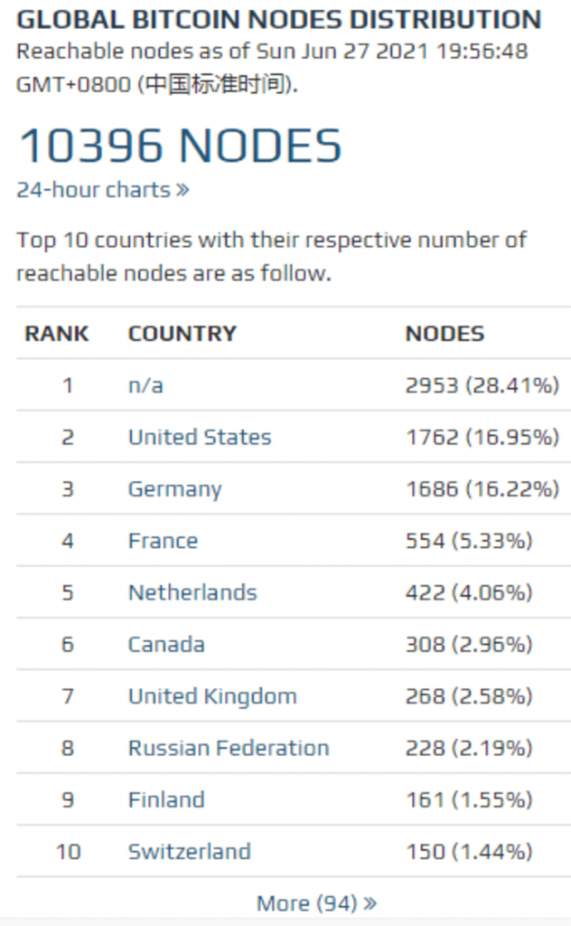 За неделю количество узлов в биткоине увеличилось на 10,55%, а количество узлов в эфириуме снизилось на 4,39%. По состоянию на 27 июня насчитывалось 10396 узлов биткоина, что на 10,55% больше, чем на прошлой неделе, из них 1762 узла находились в США, 1686 узла находились в Германии, и 228 узлов находились в России (8), на долю каждого из которых приходилось 16,95%, 16,22% и 2,19% от общего числа узлов биткоина соответственно. Россия уступила место в рейтинге Великобритании.
