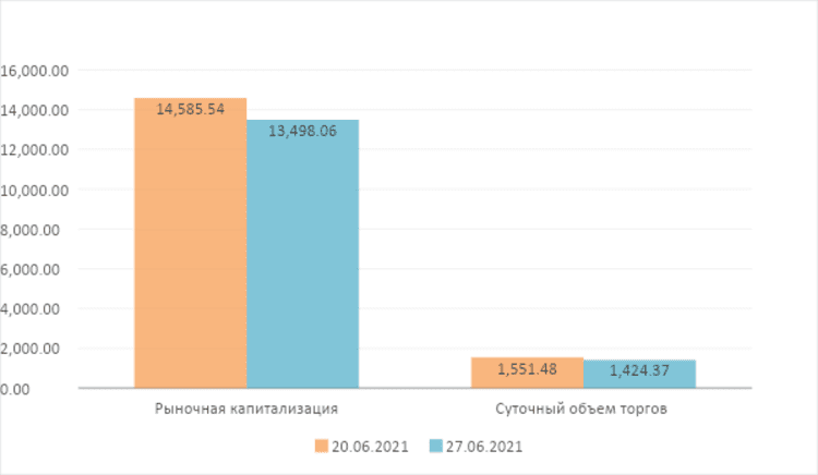 На неделе с 21 июня по 27 июня общая рыночная капитализация 100 ведущих криптовалют снизилась на 6,38%, при этом 92 проекта снизились в стоимости. По данным coinmarketcap, по состоянию на 27 июня 2021 года общая рыночная капитализация криптовалют составила $ 1367,7 млрд снизившись на 6,38%, а общая рыночная капитализация 100 ведущих криптовалют составила $ 1349,8 млрд снизившись на 7,46% по сравнению с прошлой неделей. Среди криптовалют увеличивших капитализацию наибольший рост на 48,71% у CELO, в рейтинге рыночной капитализации проект поднялся с 105 до 71 места. Больше всего снизилась рыночная капитализация проекта KSM - 40,71%, в результате рыночная капитализация упала до 71 места. CELO (Celo, вырос на теперь №71, рост составил 48,71%, сейчас 71 место в рейтинге рыночной капитализации.