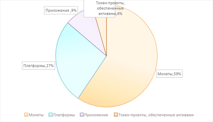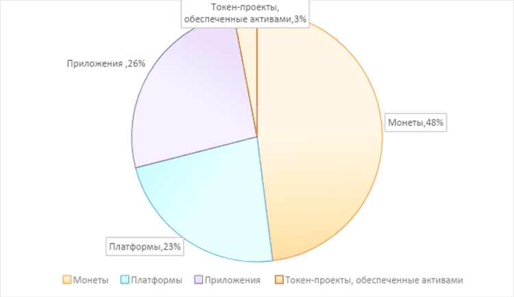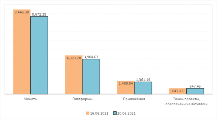 В сегменте 100 ведущих криптовалютных проектов, наибольшее снижение общей рыночной капитализации у проектов платформ. Средняя рыночная стоимость больше всего снизилась у приложений.