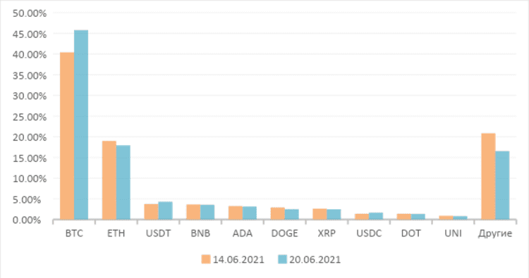 Рисунок 1.3: Доля рынка ТОП-10 криптовалют в общем объеме изменений на рынке криптовалют