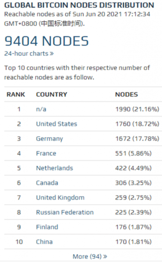 За неделю количество узлов в биткоине сократилось на 1,55%, а количество узлов в эфириуме увеличилось на 6,41%. По состоянию на 20 июня насчитывалось 9404 узла биткоина, что на 1,55% меньше, чем на прошлой неделе, из них 1760 узлов находились в США, 1672 узла находились в Германии, и 232 узлов находились в России (8), на долю каждого из которых приходилось 18,72%, 17,78% и 2,39% от общего числа узлов биткоина соответственно. Россия уступила место в рейтинге Великобритании.