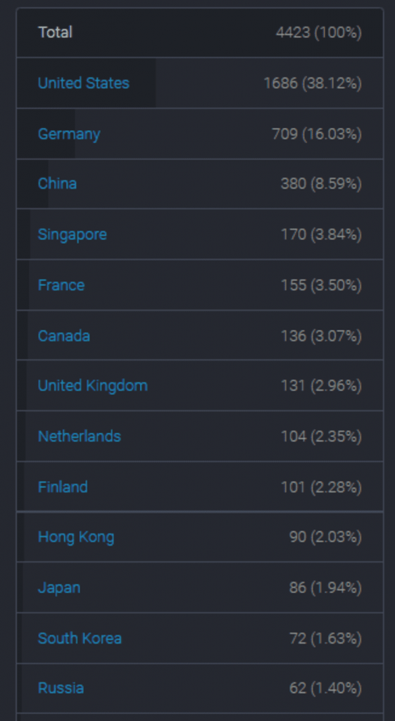 По состоянию на 20 июня насчитывалось 4369 узла эфириума, что на 6,41% больше, чем на предыдущей неделе. В частности, в США насчитывалось 1664 узлов, 703 узла в Германии и 345 узлов в Китае, на каждый из которых приходилось 38,09%, 16,09% и 7,90% от общего числа узлов соответственно.