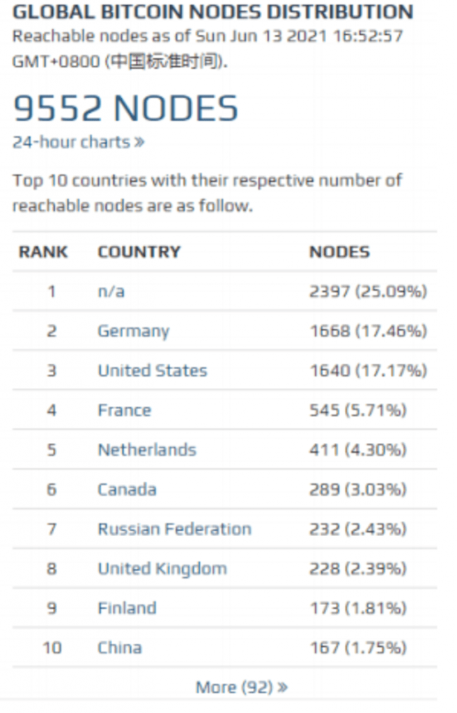 За неделю количество узлов в биткоине сократилось на 1,19%, а количество узлов в эфириуме увеличилось на 3,37%. По состоянию на 13 июня насчитывалось 9552 узла биткоина, что на 1,19% меньше, чем на прошлой неделе, из них 1668 узлов находились в Германии, 1640 узла находились в США, и 232 узлов находились в России (№7), на долю каждого из которых приходилось 17,46%, 17,17% и 2,43% от общего числа узлов биткоина соответственно.
