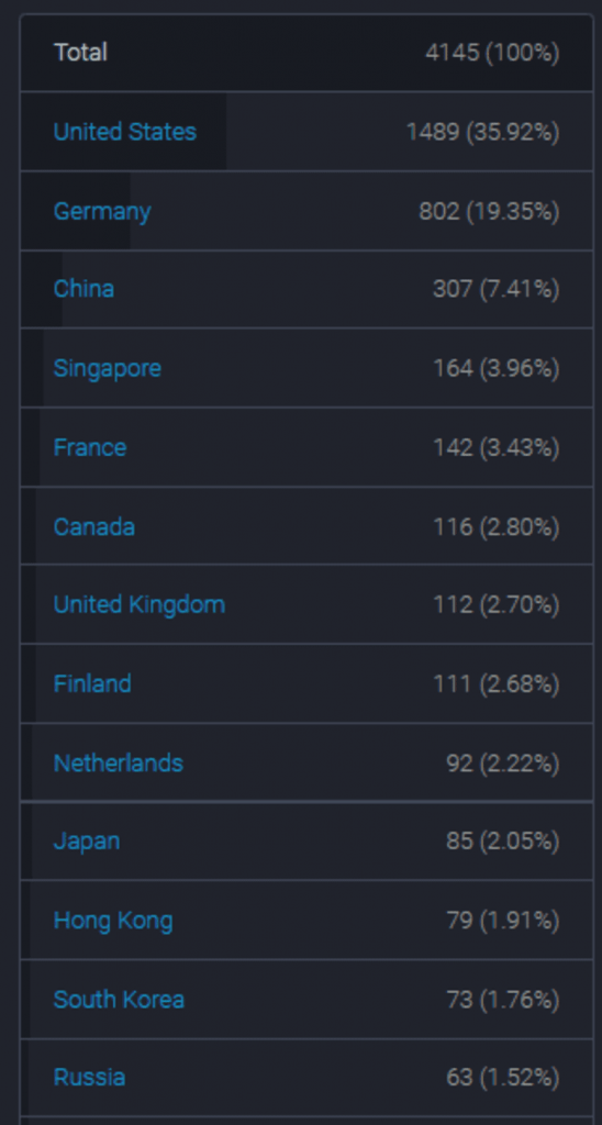 По состоянию на 13 июня насчитывалось 4106 узла эфириума, что на 3,37% больше, чем на предыдущей неделе. В частности, в США насчитывалось 1447 узлов, 791 узла в Германии и 317 узла в Китае, на каждый из которых приходилось 35,97%, 19,26% и 7,72% от общего числа узлов соответственно.