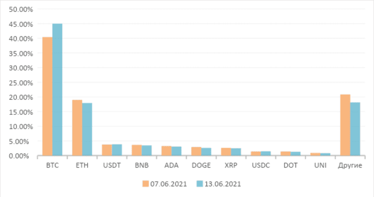 Рыночная стоимость 10 ведущих криптовалют увеличилась, распределение доли рынка осталось стабильным. По состоянию на 13 июня 2021 года общая рыночная капитализация 10 ведущих криптовалют составила $1333,7 млрд увеличившись на 1,36% по сравнению с прошлой неделей, составив 81,87% от общей рыночной капитализации криптовалют, увеличившись на 2,70% по сравнению с прошлой неделей. Доля рыночной стоимости проектов TOP10 в основном стабильна. Доминирование BTC составило 44,96%, увеличившись на 4,55% по сравнению с прошлой неделей.