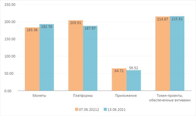 В сегменте 100 ведущих криптовалютных проектов, наибольшее снижение общей рыночной капитализации у проектов приложений. Средняя рыночная стоимость больше всего снизилась так же у приложений. По состоянию на 13 июня 2021 года общая рыночная стоимость проектов цифровых монет достигла $944,5 млрд, увеличившись на 5,13%. Средняя рыночная стоимость проектов цифровых монет достигла $19,2 млрд, увеличившись на 5,13%. Общая рыночная стоимость платформенных проектов достигла $432,3 млрд, снизившись на 7,82%.