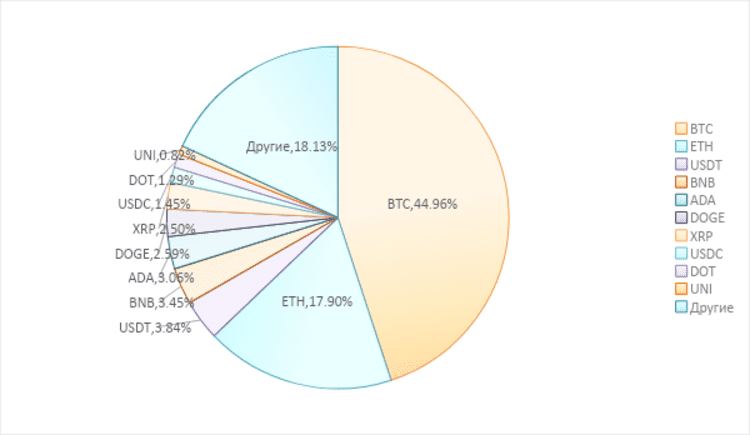 Рисунок 1.2: Доля рынка ТОП-10 криптовалют в общем объеме рынка криптовалют
