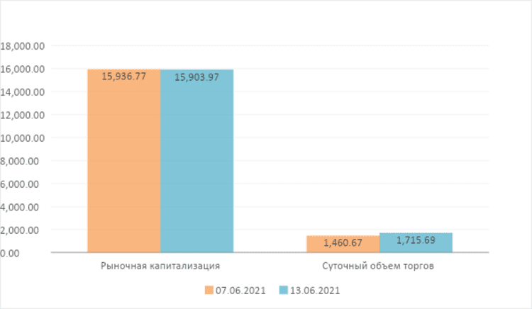 На неделе с 7 июня по 13 июня общая рыночная капитализация 100 ведущих криптовалют снизилась на 1,98%, при этом 81 проект уменьшился в стоимости. По данным coinmarketcap, по состоянию на 13 июня 2021 года общая рыночная капитализация криптовалют составила $1629,1 млрд снизившись на 1,98%, а общая рыночная капитализация 100 ведущих криптовалют составила $1590,3 млрд снизившись на 0,21% по сравнению с прошлой неделей.