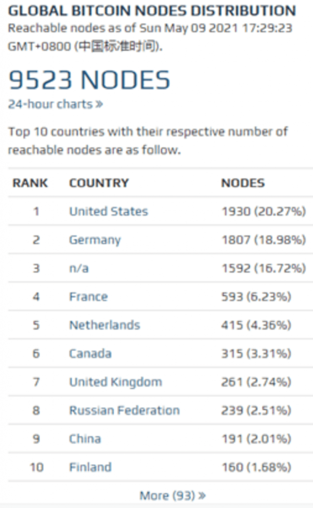 За неделю количество нод биткоина уменьшилось на 1,08%, количество нод сети эфириума увеличилось на 2,04%. По состоянию на 9 мая 2021 года насчитывалось 9523 нод биткоина, по сравнению с предыдущей неделей их количество уменьшилось на 1,08%. 1930 нод находились в США, 1807 нод — в Германии и 239 узлов в России (№8), каждый из которых составляет 20,27%, 18,98% и 2,51% от общего числа нод биткоина соответственно.