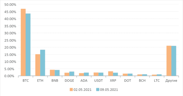 Рыночная стоимость 10 ведущих криптовалют увеличилась, распределение рыночной доли осталось стабильным. По состоянию на 9 мая 2021 года общая рыночная стоимость топ-10 криптовалют составила $2386,1, увеличившись на 11,18% по сравнению с прошлой неделей. Доминирование BTC составило 43,58%, что на 3,27% меньше, чем на прошлой неделе.