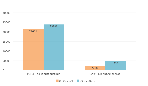 По состоянию на 9 мая 2021 года биткоин торговался по цене $58232,32, что на 2,87% выше его цены на прошлой неделе. Эфириум торговался по цене $3928,84, что на 33,20% выше его цены на прошлой неделе.