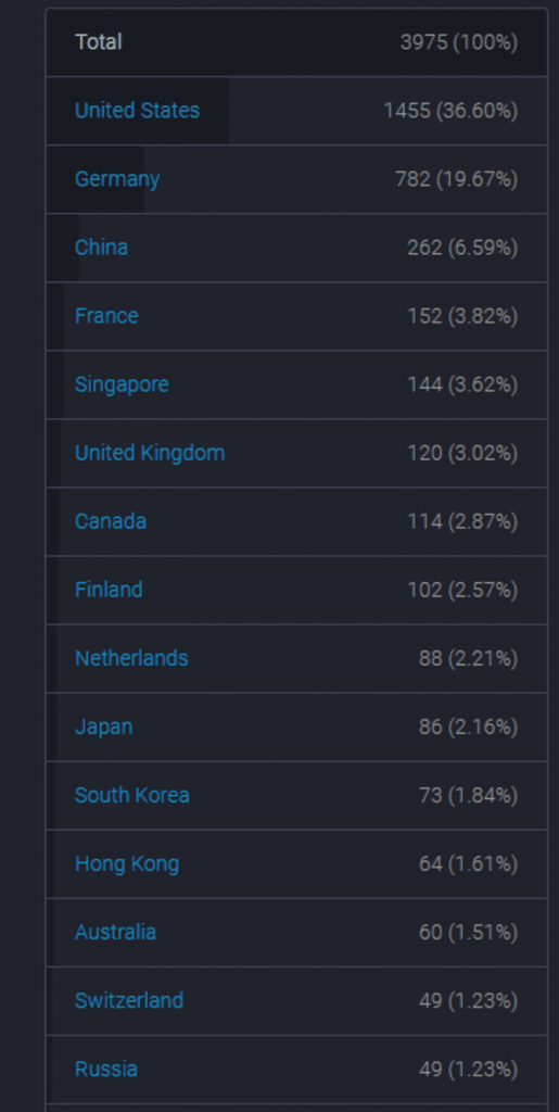 По состоянию на 9 мая 2021 года насчитывалось 4055 нод эфириума, что на 2,04% больше, чем на предыдущей неделе. В частности, в США насчитывалось 1483 нод, в Германии — 829 нод, в Китае — 242 ноды, на долю каждой из которых приходилось соответственно 36,57%, 20,44%, 5,97% от общего числа. На сегодняшний день в России насчитывается 49 узлов, страна занимает 15 место по количеству узлов, потеряв одно место в рейтинге и один узел по сравнению с прошлой неделей.