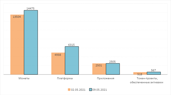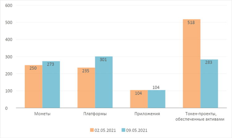 В сегменте топ-100 криптовалютных проектов больше всего увеличилась общая рыночная стоимость платформенных проектов. По состоянию на 9 мая 2021 года общая рыночная стоимость проектов цифровых монет достигла $1447,4 млрд., увеличившись на 7,19%. Средняя рыночная стоимость проектов цифровых монет достигла $27,3 млрд, увеличившись на 9,21%. Общий объем рынка платформенных проектов достиг $631,4 млрд., увеличившись на 27,89%. Средняя рыночная капитализация платформенных проектов достигла $30,0 млрд, увеличившись на 27,89%. Общая рыночная стоимость проектов класса приложений достигла 250,5 млрд долларов США, увеличившись на 0,17%. Средняя рыночная капитализация проектов класса приложений достигла $10,4 млрд, увеличившись на 0,17%. Общая рыночная стоимость проектов токенов, обеспеченных активами, достигла $56,6 млрд, увеличившись на 9,41%. Средняя рыночная стоимость проектов токенов, обеспеченных активами, достигла $28,3 млрд, снизившись на 45,29%.