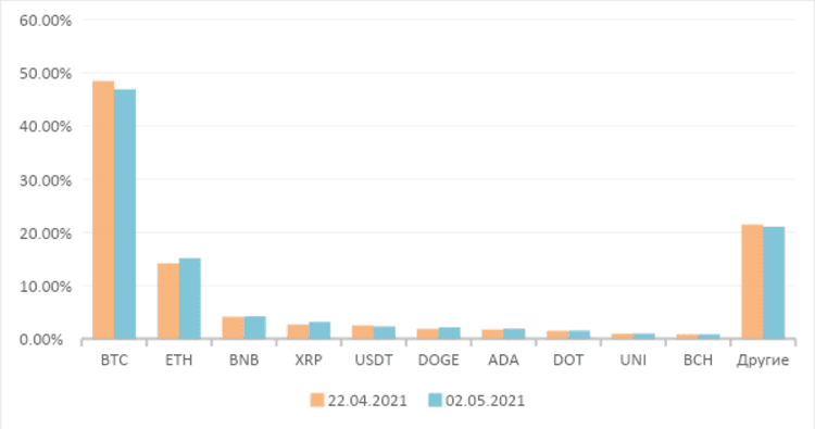 Рыночная стоимость 10 ведущих криптовалют увеличилась, распределение рыночной доли осталось стабильным. По состоянию на 2 мая 2021 года общая рыночная стоимость топ-10 криптовалют составила $1784,3 млрд, увеличившись на 20,10% по сравнению с предыдущей неделей, что составляет 78,96% от общей рыночной капитализации криптовалют – увеличение на 0,40% по сравнению с предыдущей неделей. Доминирование BTC составило 46,86%, уменьшившись на 1,58% по сравнению с прошлой неделей.