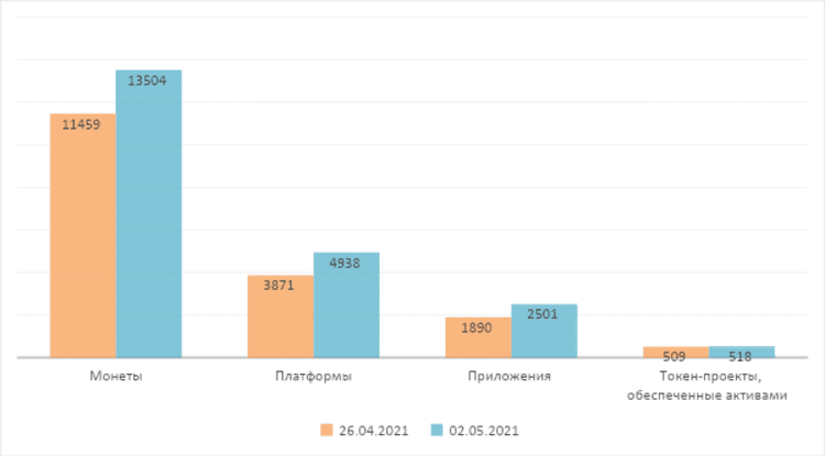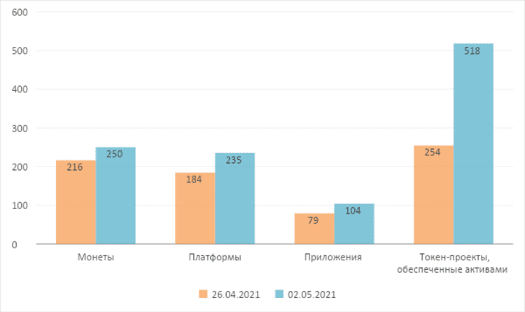 Среди сегментов ТОП-100 криптовалютных проектов наибольший прирост общей рыночной стоимости получили проекты приложений. Больше всего увеличилась средняя рыночная стоимость проектов, обеспеченных активами. По состоянию на 2 мая 2021 года общая рыночная стоимость проектов цифровых монет достигла $1350,4 млрд, увеличившись на 17,84%. Средняя рыночная стоимость проектов цифровых монет достигла $25,0 млрд, увеличившись на 15,66%. Общий объем рынка платформенных проектов достиг $493,7 млрд, увеличившись на 27,56%. Средняя рыночная капитализация платформенных проектов достигла $23,5 млрд, увеличившись на 27,56%. Общая рыночная стоимость проектов класса приложений достигла $250,1 млрд, увеличившись на 32,34%. Средняя рыночная стоимость проектов класса приложений достигла $10,4 млрд, увеличившись на 32,34%. Общая рыночная стоимость проектов токенов, обеспеченных активами, достигла $51,7 млрд, увеличившись на 1,80%. Средняя рыночная стоимость токенов, обеспеченных активами, достигла $51,7 млрд, увеличившись на 103,61%.