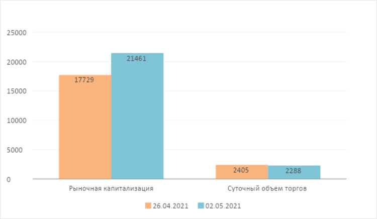 Среди криптовалют увеличивших капитализацию, наибольший рост у OKB – на 158,32%, в рейтинге рыночной капитализации она поднялась с 86 места до 55; наибольшее снижение на 0,00% произошло у BUSD, в результате чего рейтинг рыночной капитализации понизился с 21 места до 23. Кроме того, в TOP-100 вошли 2 проекта: XVS (Venus, рост 99,00%, сейчас 90 место), BAKE (BakeryToken, рост 565,05%, сейчас 79 место). По состоянию на 2 мая 2021 года биткоин торговался по цене $56631,08, что на 15,60% выше его цены на позапрошлой неделе. Ethereum торговался по цене $2952,06, что на 27,56% выше цены на позапрошлой неделе.