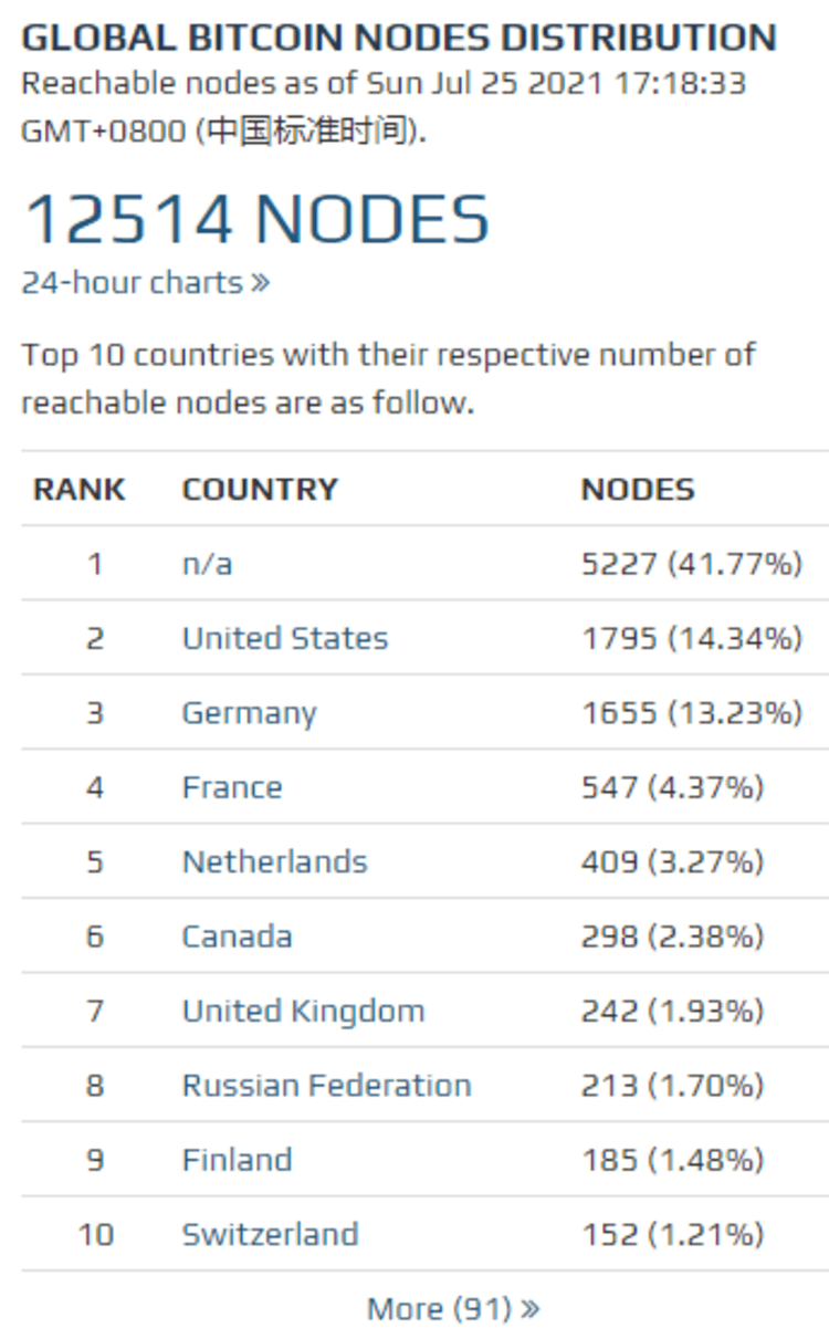 За неделю количество узлов в биткоине уменьшилось на 3,70%, а количество узлов в эфириуме увеличилось на 2,04%. По состоянию на 25 июля насчитывалось 12514 узлов биткоина, что на что 3,70% меньше, чем на прошлой неделе, из них 1795 узлов в США, 1655 узлов в Германии, и 213 узлов находятся в России, на долю каждого государства приходилось 14,34%, 13,23% и 1,70% от общего числа узлов биткоина соответственно. Россия остается на 8 месте рейтинга 3 неделю.