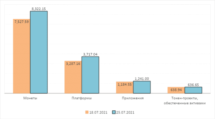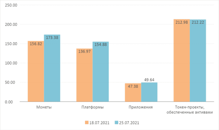 В сегменте 100 ведущих криптовалютных проектов, наибольшее увеличение общей рыночной капитализации у проектов платформ. Так же их рыночная стоимость увеличилась больше всего. По состоянию на 25 июля 2021 года общая рыночная стоимость проектов цифровых монет достигла $ 832,2 млрд, увеличившись на 10,56%. Средняя рыночная стоимость проектов цифровых монет достигла $ 17,3 млрд, увеличившись на 10,56%. Общая рыночная стоимость платформенных проектов достигла $ 371,7 млрд, увеличившись на 13,08%. Средняя рыночная капитализация платформенных проектов достигла $15,4 млрд, увеличившись на 13,08%.