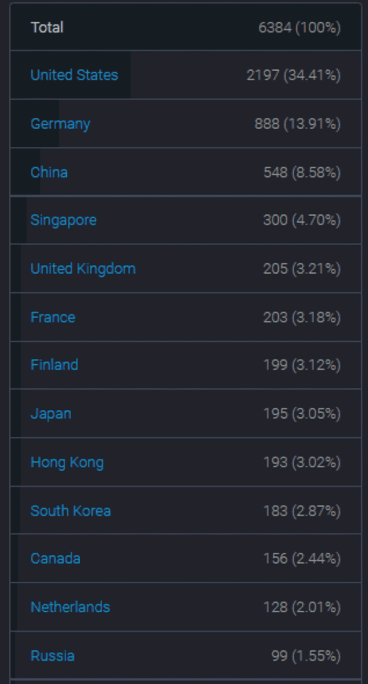 По состоянию на 25 июля насчитывалось 6458 узла эфириума, что на 2,04% больше, чем на предыдущей неделе. В частности, в США насчитывалось 2217 узлов, 906 узлов в Германии и 556 узлов в Китае, на каждый из которых приходилось 34,33%, 14,03%, 8,61% от общего числа узлов соответственно.