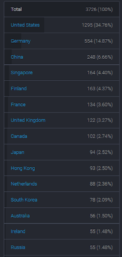 По состоянию на 17 октября насчитывалось 3664 узла эфириума, что на 2,14% меньше, чем на предыдущей неделе. В частности, в США насчитывалось 1276 узлов, 555 узлов в Германии, на каждый из которых приходилось 34,83%, 15,15% от общего числа узлов соответственно.