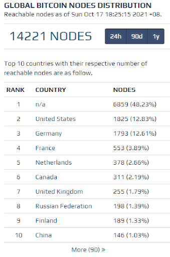 За неделю количество узлов в биткоине увеличилось на 8,71%, а количество узлов в эфириуме уменьшилось на 2,14%. По состоянию на 17 октября насчитывалось 14221 узлов биткоина, из них 1825 узлов в США, 1793 узлов в Германии, и 198 узлов находятся в России, на долю каждого государства приходилось 14,16%, 13,61% и 1,39% от общего числа узлов биткоина соответственно. Россия занимает 8 место в рейтинге по количеству узлов, поднявшись на одно место в рейтинге по сравнению с прошлой неделей.