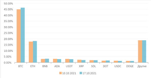 Рисунок 1.3: Доля рынка ТОП-10 криптовалют в общем объеме изменений на рынке криптовалют