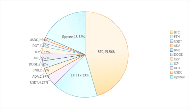 Рисунок 1.2: Доля рынка ТОП-10 криптовалют в общем объеме рынка криптовалют