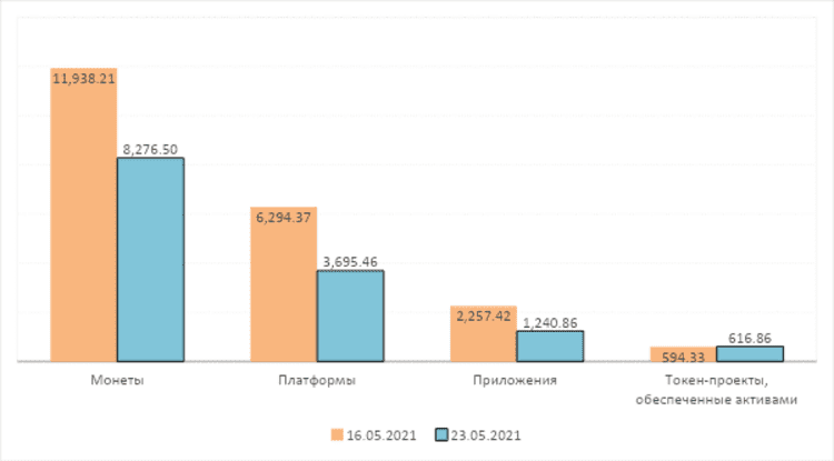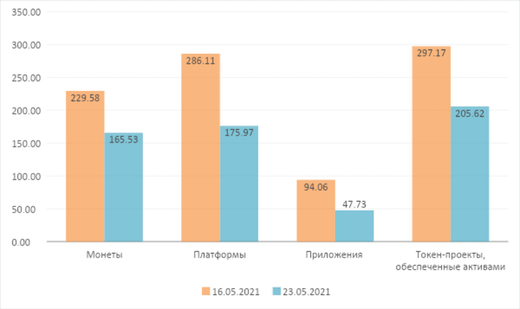 В сегменте 100 ведущих криптовалютных проектов, больше всего снизилась общая рыночная капитализация приложений. Их средняя рыночная стоимость также уменьшилась больше всего. По состоянию на 23 мая 2021 года, общая рыночная стоимость проектов цифровых монет достигла $827,6 млрд, снизившись на 30,67%. Средняя рыночная стоимость проектов цифровых монет достигла $16,5 млрд, снизившись на 27,90%. Общая рыночная стоимость платформенных проектов достиг $369,5 млрд, снизившись на 41,29%. Средняя рыночная капитализация платформенных проектов достигла $17,5 млрд, снизившись на 38,49%. Общая рыночная стоимость проектов класса приложений достигла 124,0 млрд долларов США, снизившись на 45.03%. Средняя рыночная капитализация проектов класса приложений достигла $4,77 млрд, снизившись на 49,26%. Общая рыночная стоимость проектов токенов, обеспеченных активами, достигла $61,6 млрд, увеличившись на 3,79%. Средняя рыночная стоимость проектов токенов, обеспеченных активами, достигла $20,5 млрд, снизившись на 30,80%.