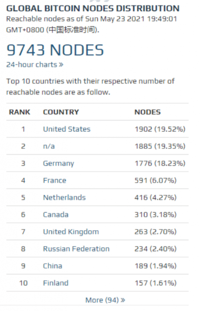 За неделю количество узлов в биткоине увеличилось на 0,40%, а количество узлов в эфириуме увеличилось на 5,53%. По состоянию на 23 мая насчитывалось 9743 узла биткоина, что на 0,40% больше, чем на прошлой неделе, из них 1902 узла находились в США, 1776 узлов находились в Германии и 234 узлов находились в России (№8), на долю каждого из которых приходилось 19,52%, 18,23% и 2,40% от общего числа узлов биткоина соответственно.