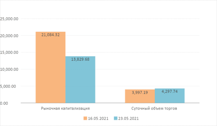 По состоянию на 23 мая 2021 года биткоин торговался по цене $34770,58, что на 25,15% ниже цены на прошлой неделе. Эфириум торговался на $2109,58, что на 41,15% ниже, чем на прошлой неделе.