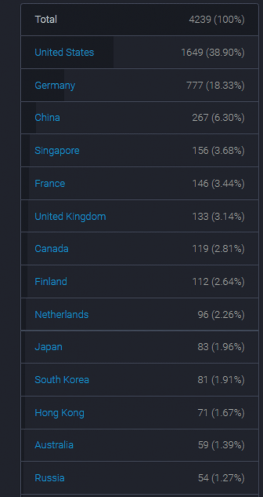 По состоянию на 23 мая 2021 года насчитывалось 4240 узлов эфириума, что на 5,53%больше, чем на предыдущей неделе. В частности, в США насчитывалось 1648 узлов, в Германии — 772 узла, а в Китае — 26 узлов, каждый из которых составлял 38,87%. узлов в Германии и 266 узлов в Китае, на долю каждого из которых приходится 38,87%, 18,21%, 6,27% от общего числа узлов, соответственно.