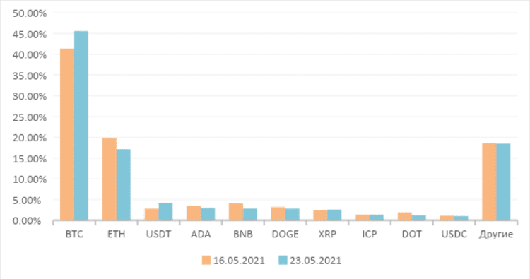 Рыночная стоимость 10 ведущих криптовалют снизилась, распределение доли рынка осталось стабильным. По состоянию на 23 мая 2021 года общая рыночная капитализация 10 ведущих криптовалют составила $1382,9 млрд, снизившись на 34,41% по сравнению с прошлой неделей. Доля рыночной стоимости проектов TOП-10 в основном стабильна. Доминирование BTC составило 45,56%, увеличившись на 4,18% по сравнению с прошлой неделей.