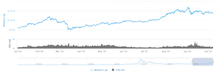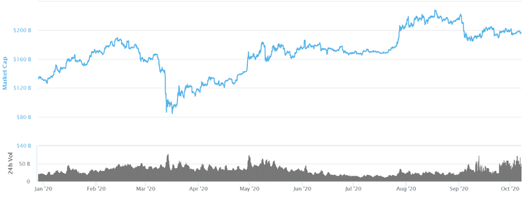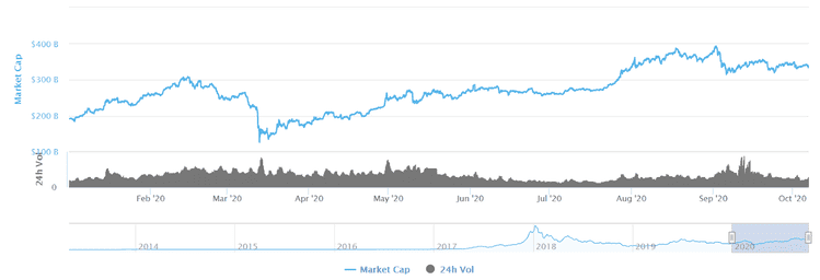 За третий квартал 2020 г. совокупная капитализация криптовалютного рынка выросла более чем на треть и по состоянию на 1 октября составила 345,93 млрд долларов. По отношению к началу году общая стоимость криптовалют выросла на 44,6%.