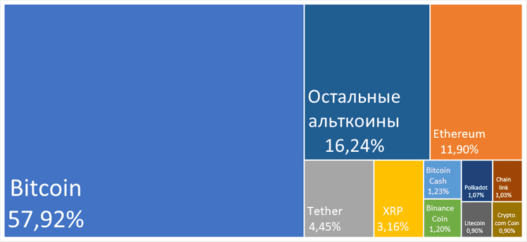 В 10-ку лидеров по объему капитализации по состоянию на начало октября помимо Bitcoin входят Ethereum, Tether, XRP, Bitcoin Cash, Binance Coin, Polkadot, Chainlink, Litecoin и Crypto.com Coin.