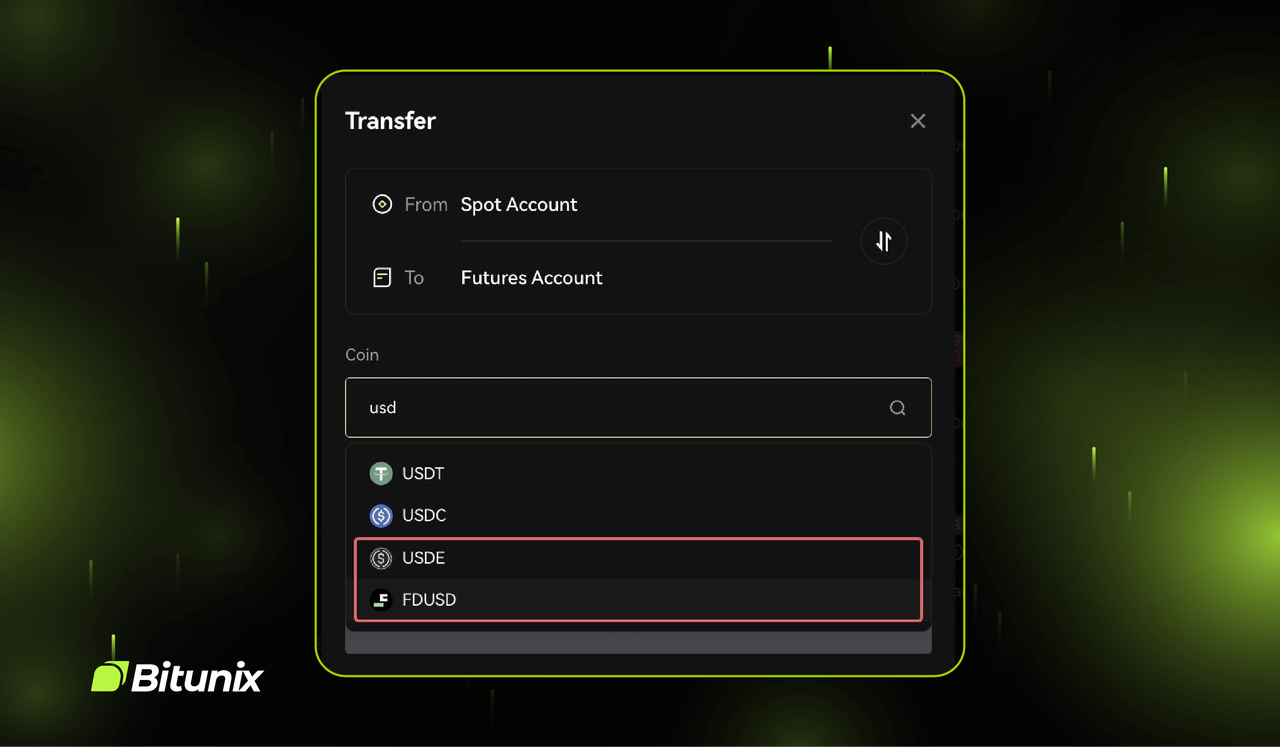 Теперь трейдеры на Bitunix могут использовать USDe и FDUSD напрямую в качестве маржи для фьючерсных контрактов USDT-M. Вместо того чтобы конвертировать эти стейблкоины в USDT, пользователи могут просто перевести USDe или FDUSD со своего спотового счета на фьючерсный счет и начать торговать сразу же. Это экономит время и снижает количество лишних транзакций.