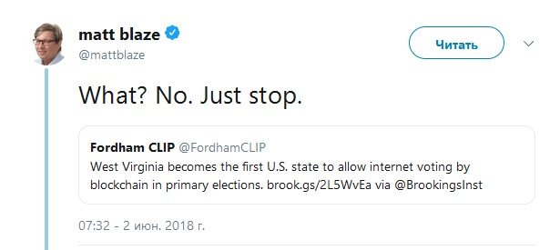 Мэтт БЛЕЙЗ, специалист по системам безопасности, считает, что необходимо немедленно прекратить все эти сомнительные опыты с блокчейном в таком важном деле, как выборы в США. Его аргументы: новая технология несет новые вызовы; могут возникнуть проблемы, которые еще не изучены; существуют более простые и безопасные способы модернизации систем голосования.